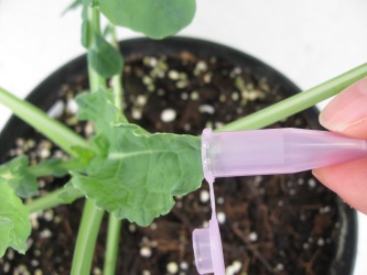 Prélèvement d’un échantillon sur jeune plant pour contrôler son état sanitaire avant commercialisation